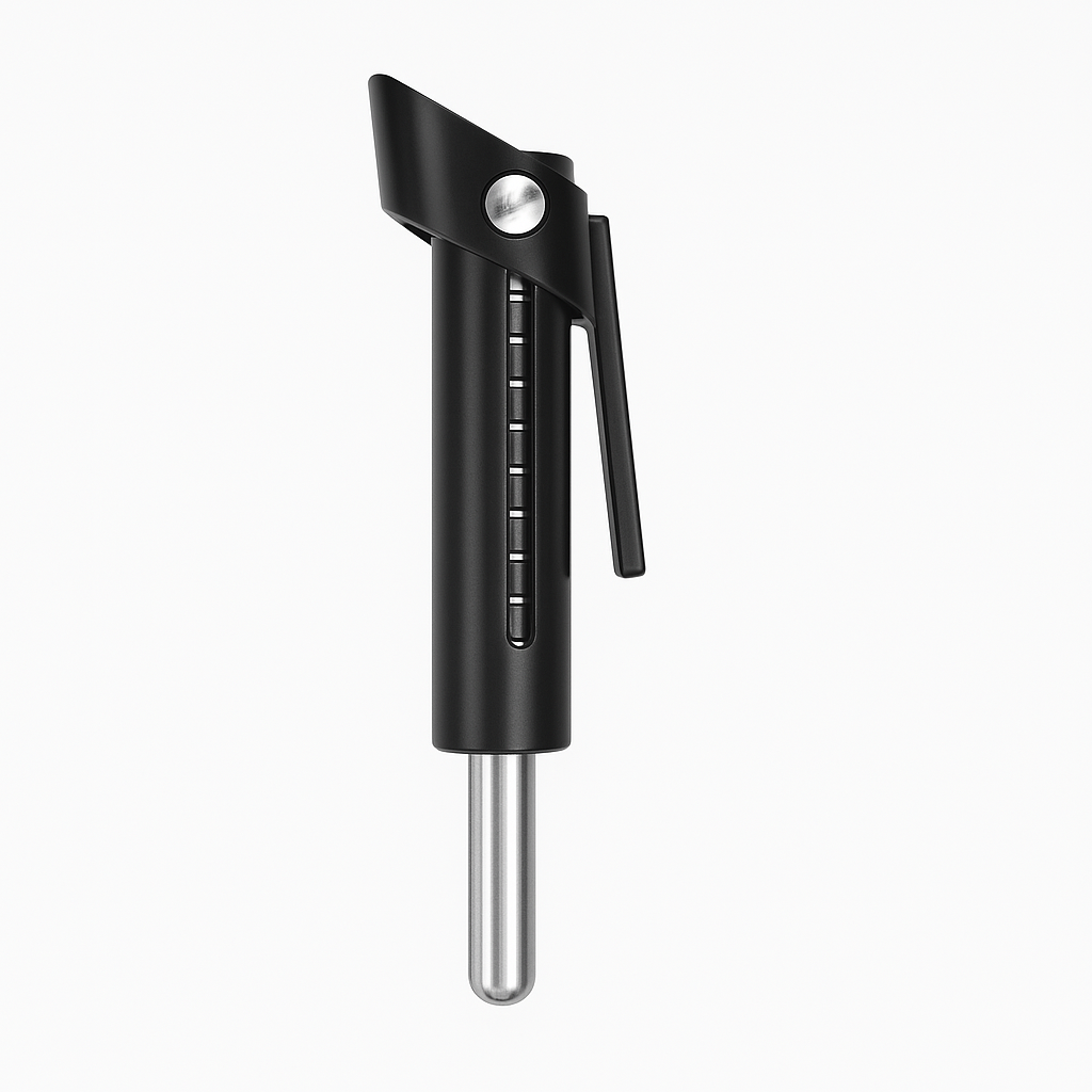 Zuerst ziehst du den Pin auf und hakst das obere Stück unten ein.